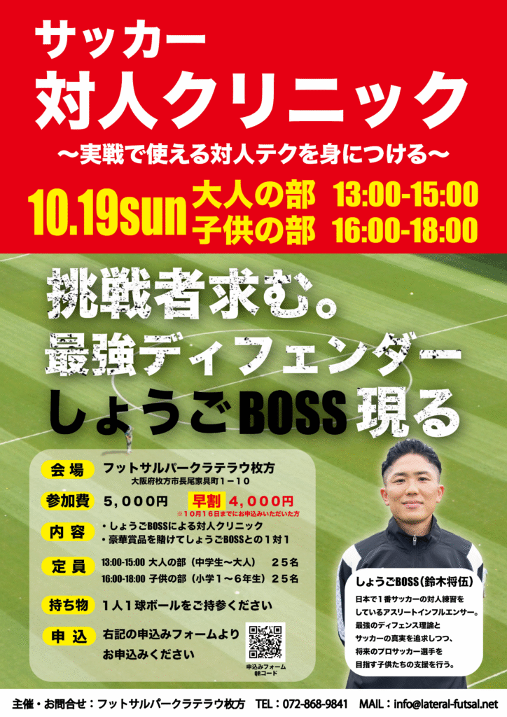 最強ディフェンダーしょうごBOSSによるサッカー対人クリニック 日時:10月19日(日) 参加費:おひとり様 5,000円、 早割4,000円(10月16日までにお申込みの方) 対象:13:00-15:00大人の部 中学 […]
